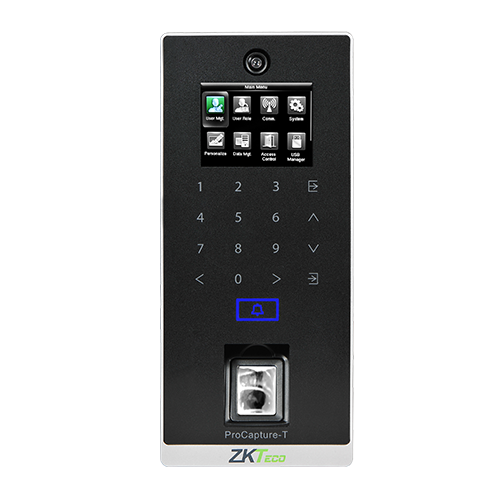 В терминале контроля доступа ProCapture-T установлен самый современный сенсор отпечатков пальцев SilkID. Он обеспечивает высокую скорость идентификации даже сухих, влажных и грубых поверхностей пальцев. Сенсор способен отличить имитацию и реальный отпечаток пальца человека, что обеспечивает больший уровень защищенности всей вашей системы безопасности. Скорость проверки значительно увеличена благодаря использованию новейшего алгоритма анализа и новой аппаратной платформе ZMM220, оснащенной процессором 1,2 ГГц. Сенсорная клавиатура делает легкой и понятной настройку терминала, регистрацию и удаление посетителей. Встроенная камера позволяет делать фотографии и записывать их в журнале событий.